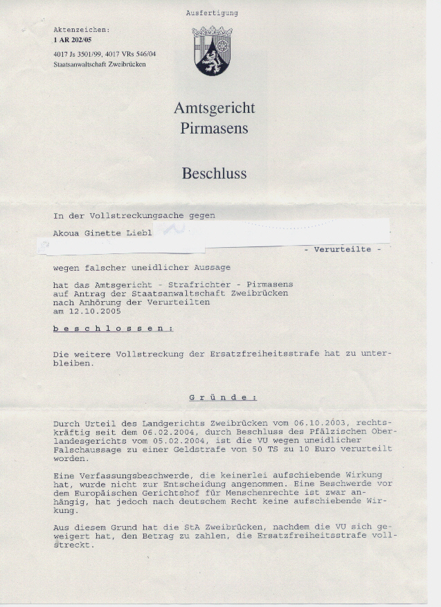 rechtskräftig freigesprochen bin. In dieser Angelegenheit hat die Staatsanwaltschaft Zweibücken ein Ermittlungsverfahren gegen meine Ehefrau Ginette Liebl wegen falscher Aussage eingeleitet, obwohl meine Ehefrau keine