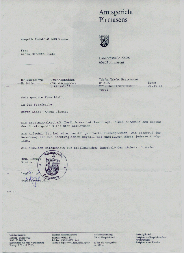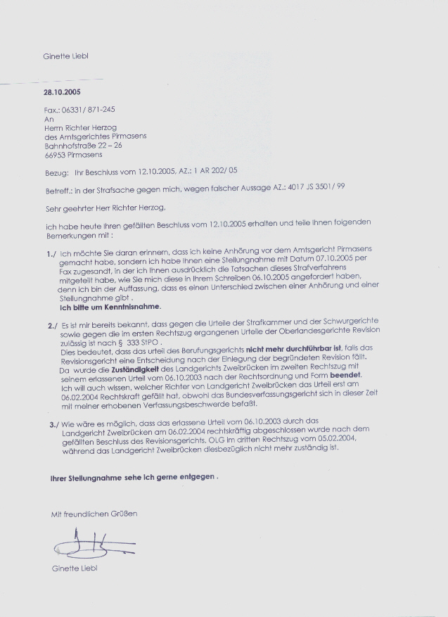 66953 Pirmasens Bezug: Ihr Schreiben vom 06.10.2005, AZ.: 1 AR 202/ 05 Betreff.: in der Strafsache gegen mich, wegen falscher Aussage AZ.: 4017 JS 3501/ 99