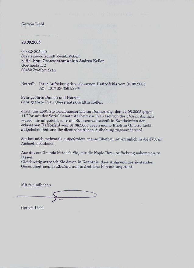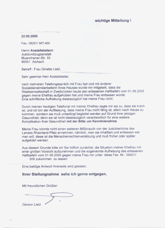 der Staatsanwaltschaft Zweibrücken erwähnt wurde, dass meine Frau in die JVA in Aichach eingeliefert würde. Nach meinem Telefonat am 15.09.2005 mit Frau Anstaltsleiterin Leicht und mit Frau Dr. Schinken von der