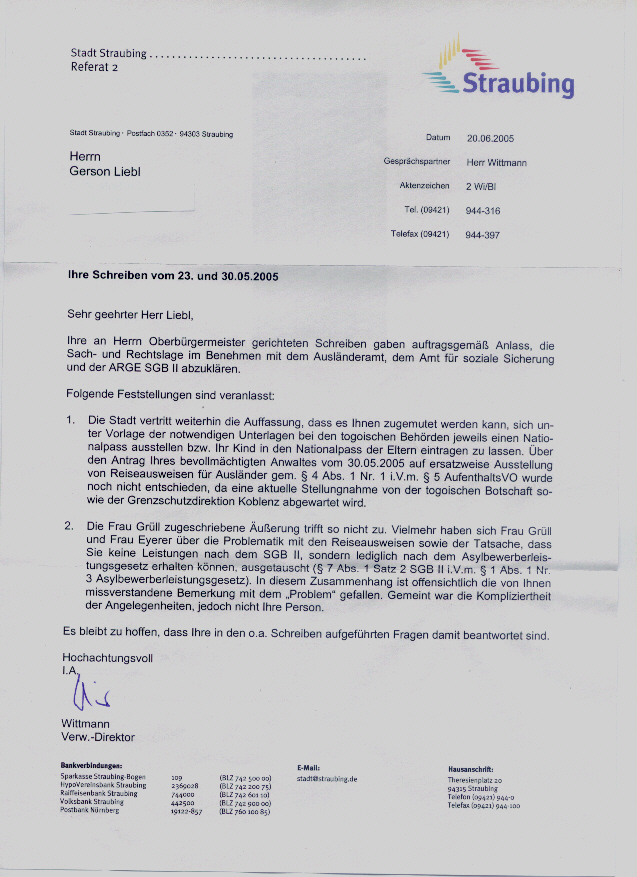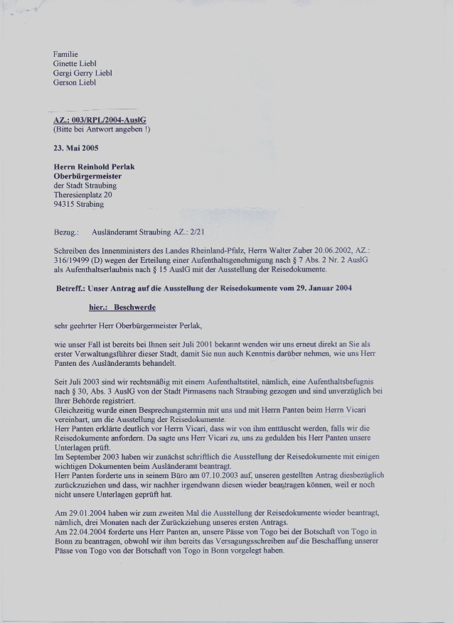 Reisedokumenten beim Ausländeramt der Stadt Straubing beantragt und wir bitten Sie, Kenntnis über folgenden Schreiben zu nehmen; denn Herr Panten hat uns bereits beim Gesprächstermin beim Herrn Bürgermeistern im