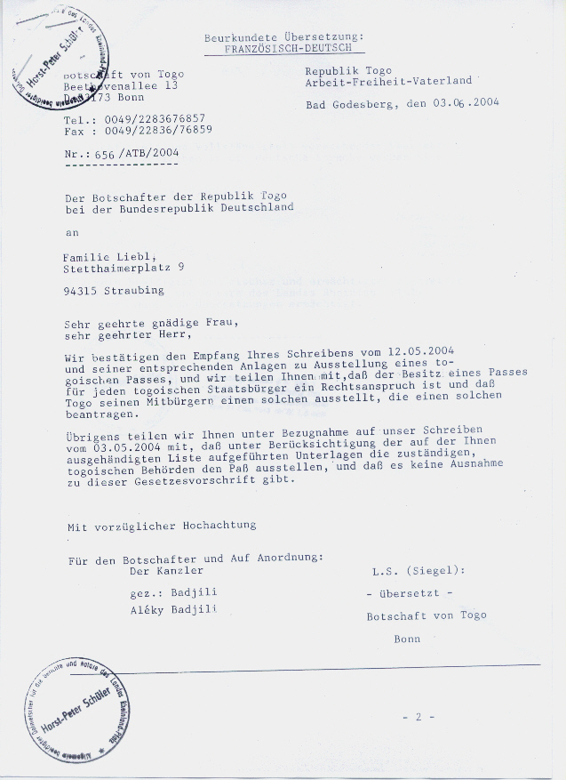 Aufgrund des Schreibens des Herrn Ratministers Aleky Badjili der Botschaft von Togo in Bonn vom 03.06.2004, AZ.: 656/ ATB/2004 wurde uns erneut mitgeteilt, dass unser Schreiben vom 12.05.2004 bei der Botschaft von Togo
