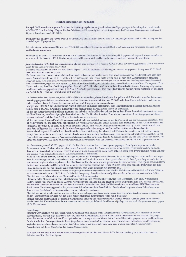 vor , das Frau Grüll ausgesprochen hat, und dies hat mich sehr tief berührt; denn ich erinnere mich sehr daran, dass einige Arbeitgeber mir im Jahr 2004 eine Arbeitsstelle versprochen haben und sich über den von mir ausgestellten Ausweisersatz mit der Aufenthaltsbefugnis von Ihrem Ausländeramt weiter erkundigen wollten, ob sie mich fest anstellen könnten. Anschließend haben diese Arbeitgeber meine Anstellung abgesagt, vielleicht hat jemand Ihrem Ausländeramt sie meine Anstellung abgeratet. Denn dies ist eine Weise, mich vor den Leute unsterblich zu blamieren und ich behalte mich dies als Diskriminierung vor .Da bitte ich Sie höflich und wäre Ihnen sehr dankbar, wenn mir Frau Grüll eine Erklärung über ihr ausgesprochenes Wort „ voll Problem „ zukommen zu lassen könnte, weil dies sehr bedeutend ist. Deshalb wende ich mich erneut bei Ihnen dringend nach dem aktuellen zustand meiner Arbeitssuche sowie meinen Antrag auf das Arbeitslosgeld II , damit Sie Kenntnis über die Wirksamkeit und den Vorteil der Ausstellung der Reisedokumente in diesem Fall nehmen; denn Ihre Intervention diesbezüglich ist sehr wichtig für mich.