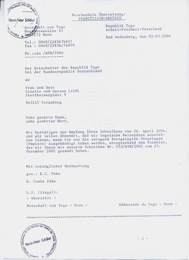 Schreibens des Botschafters von Togo in Bonn, Herrn E. Comla PAKA vom 03.05.2004, AZ.: 484/ATB/2004 nach diesem berühmten Gespräch im Mai 2004 wurde unseren Antrag vom 26.04.2004 wegen der Beschaffung unserer togoischen