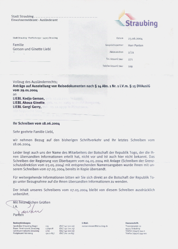 Reisepässe von Togo kommen wir erneut darauf zurück.Wir setzen Sie davon in Kenntnis, dass Herr Panten vom Ausländeramt der Stadt Straubing uns bereits aufgefordert hat, unsere Staatsangehörigkeit und die Geburtsurkunde