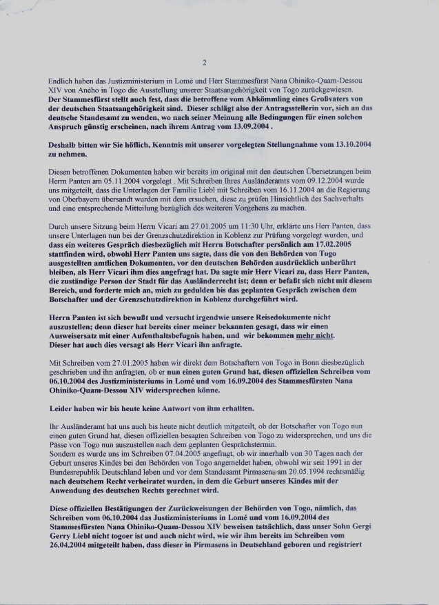 der Zurückweisungen der Behörden von Togo beweisen tatsächlich, dass unser Sohn Gergi Gerry Liebl nicht togoer ist und auch nicht würde, wie wir Ihnen bereits im Schreiben vom 26.04.2004 mitgeteilt haben, dass dieser in