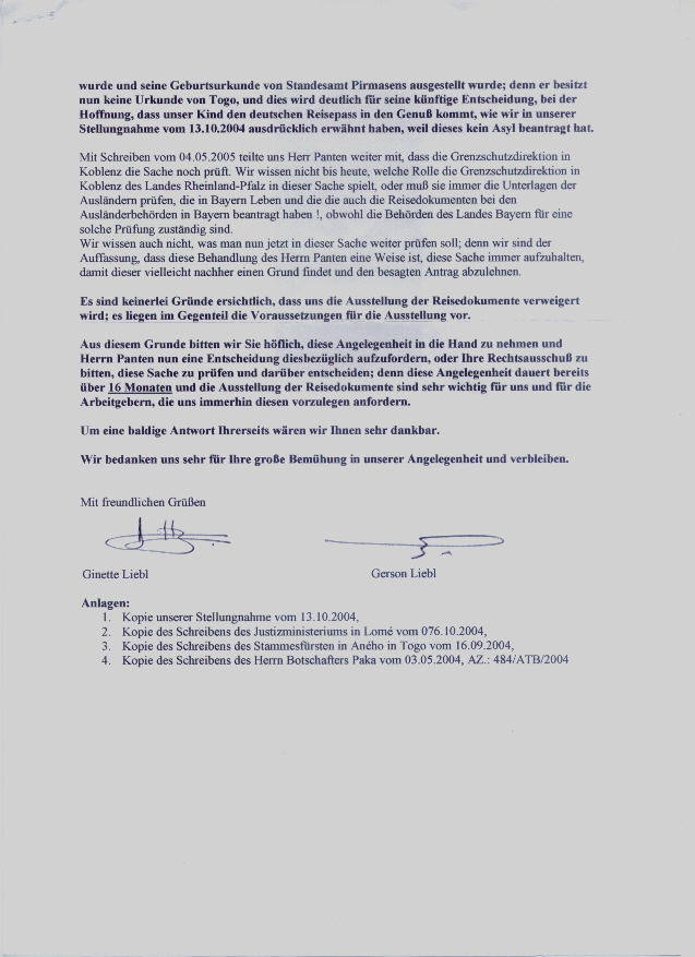 gerichtetes schreiben vom 20.09.2004 bezüglich Sachstandes der Beschaffung der Reisepässe von Togo nach Ihrem „obligatorischen“ Empfehlungsschreiben vom 07.05.2004, in dem Sie bereits im Schreiben vom 23.06.2004,