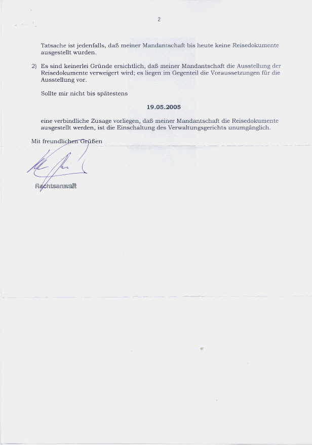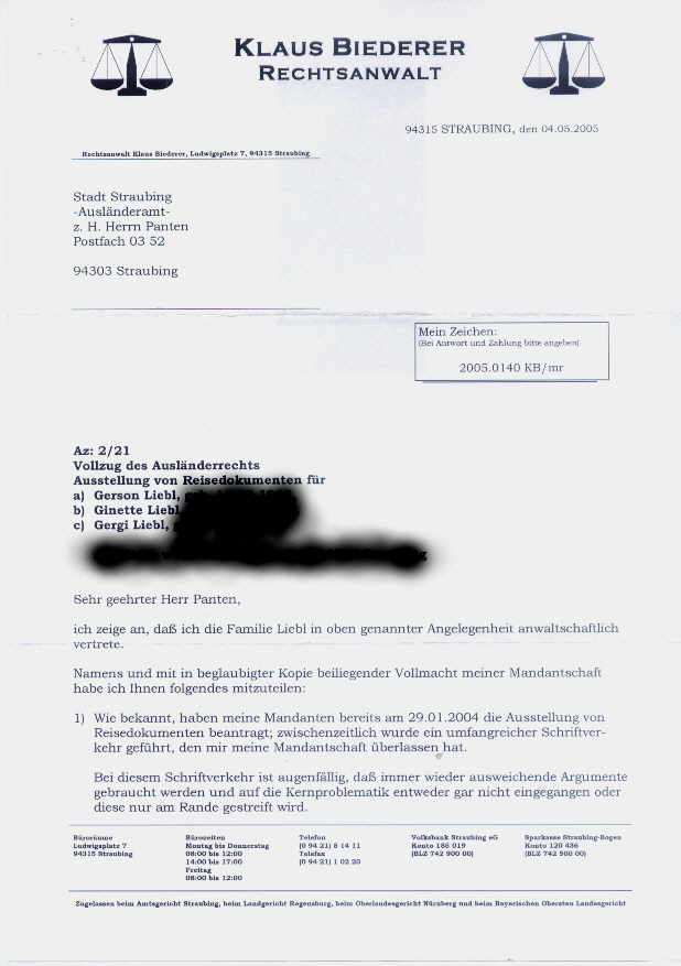 Jahr 2003 ausdrücklich gesagt, dass wir von ihm enttäuscht werden, falls wir die Reisedokumenten anfordern : 1. Unser Schreiben vom 05.09.2003 an das Ausländeramt in Straubing