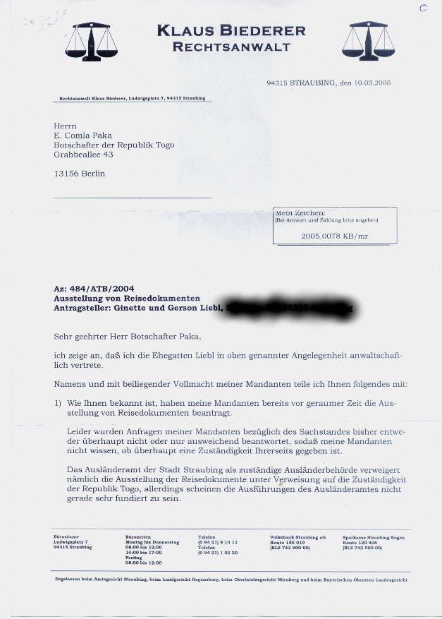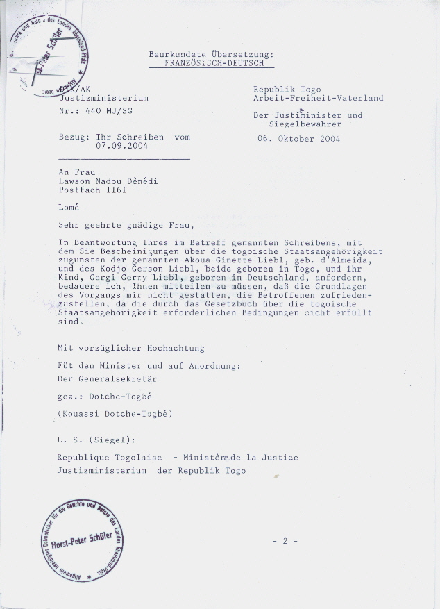Aufgrund der Zurückweisungen der offiziellen Schreiben der Botschaft von Togo in Bonn vom 03.05.2004, AZ.: 484/ATB/2004, vom 03.06.2004, AZ.: 656/ ATB/2004 und des Justizministeriums in Lomé vom 06.10.2004, AZ.: 440
