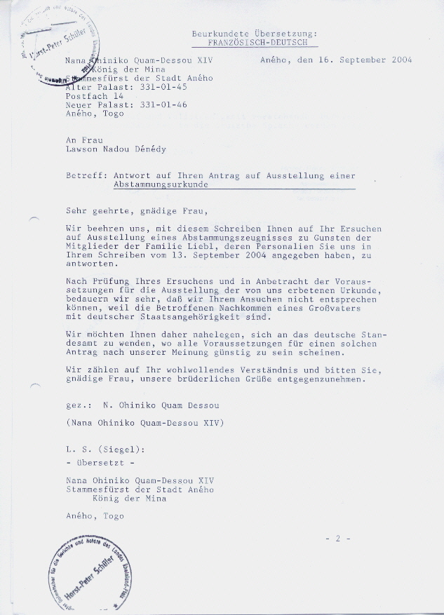 beigefügten offiziellen Schreiben des Justizministeriums in Lomé vom 06.10.2004, Nr.: 440 Mj/ SG und des Stammesfürsten d´ Aneho, Herrn Nana Ohiniko Quam-Desoou XIV vom 16.09.2004 wurde die Erteilung unserer