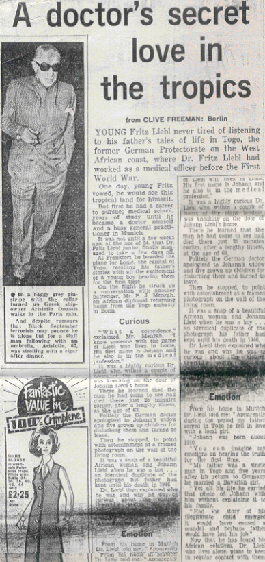 stammen kann. - Sie haben recht, das hat mir mein Vater gegeben, der ibn Togo als Arzt tätig war in der deutschen Kolinialzeit.Es ging dann darum, dass er jetzt zum ersten Mal nach Togo fliegt, um nach einem Teil